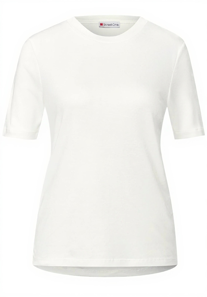 Das Shirt ist in den Größen 34 bis 46 erhältlich und in Farben wie Off White, Schwarz, Tide Blue, Almond Coral, Faded Rose, Arona Blue und Racing Red. Es besteht aus einem Baumwoll-Modalmix, der für Langlebigkeit und Formbeständigkeit sorgt, und hat eine Standardgrößenpassform.