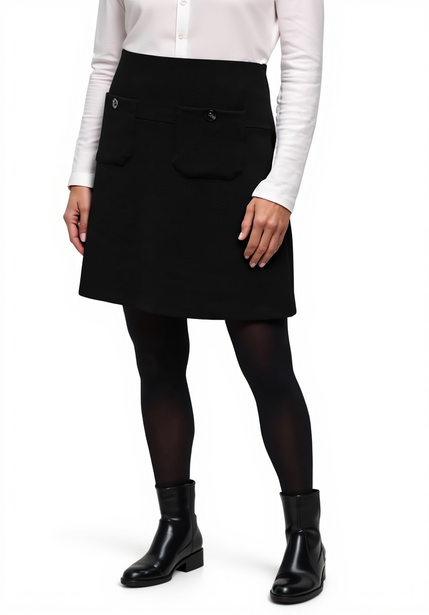 Dieser Damen Rock besticht durch seine feine Struktur und einen Materialmix mit Stretchanteil, der für Bewegungsfreiheit und Komfort sorgt. Mit aufgesetzten Taschen und einem knielangen Schnitt bietet er einen modernen Look, der sich leicht in jede Garderobe integrieren lässt.