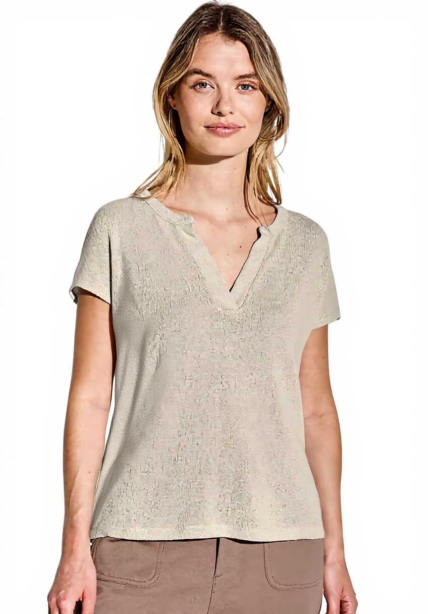 Das Shirt ist in den Größen 34 bis 46 erhältlich, mit Farboptionen wie Moonstone Sand, Deep Tint Blue, Glory Red und Smooth Sand Beige. Das Material besteht aus einem hautsympathischen Viskosemix, der leicht und atmungsaktiv ist. Modellnummer A322779 sorgt für eine perfekte Passform und einfache Pflege.