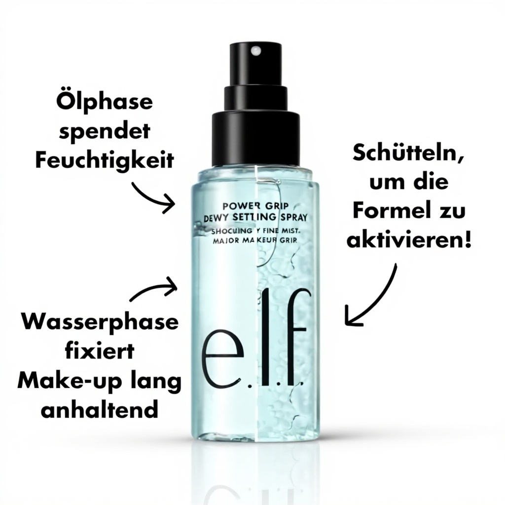 Das e.l.f. Power Grip Dewy Setting Spray verfügt über eine innovative zweiphasige Formel, die wasser- und ölbasierte Komponenten kombiniert, um Make-up zu fixieren und ein hydratisiertes, taufrisches Finish zu gewährleisten. Angereichert mit 5% Aloe-Saft, Hyaluronsäure, Squalan und Grünteesamenöl, bietet es intensive Feuchtigkeit und pflegt die Haut, ohne klebrig zu wirken.
