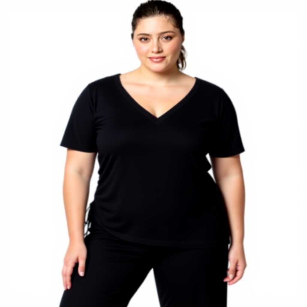 Das T-Shirt ist in den Größen S, M, L und XL erhältlich, wobei die Größe 37 Plus einer normalen Größe 46 entspricht. Die Größen sind speziell für Damen mit größeren Maßen entwickelt und bieten durch den seitlichen Tunnelzug zusätzliche Anpassungsmöglichkeiten. Das Material sorgt für angenehmen Tragekomfort und optimale Formstabilität bei jedem Einsatz.
