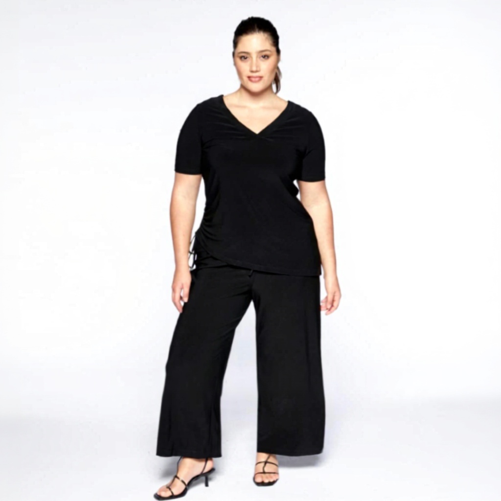 Das Fiorella Rubino Damen T-Shirt überzeugt mit einem raffinierten Tunnelzug an der rechten Seite, der individuelle Styling-Möglichkeiten bietet. Der dekorative V-Ausschnitt mit überlappenden Bündchen verleiht dem Shirt eine elegante Note, während die kurzen Ärmel für optimale Bewegungsfreiheit sorgen. Das T-Shirt ist speziell für große Größen konzipiert und bietet eine perfekte Passform für anspruchsvolle Damenmode.