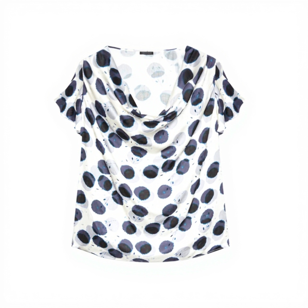 Das Fiorella Rubino Oberteil in einem ansprechenden Blauton mit dekorativer Punktoptik ist aus hochwertigem Viskose-Satin gefertigt. Der besondere Clou ist der drapierte Ausschnitt an der Vorderseite, der die Figur betont, ohne einzuengen. Kurze Flügelärmel runden das feminine Design ab und verleihen dem Top eine lässige Eleganz.
