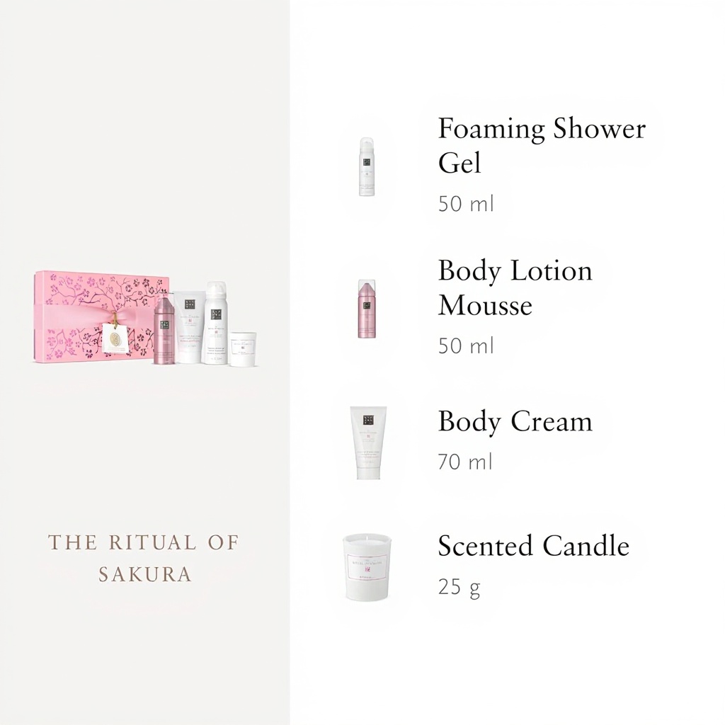 Das Set umfasst Rituals schäumendes Duschgel, feuchtigkeitsspendende Körpercreme, Körperlotions-Mousse und ein Körperpeeling, alle mit dem Duft von Kirschblüten und Reismilch.