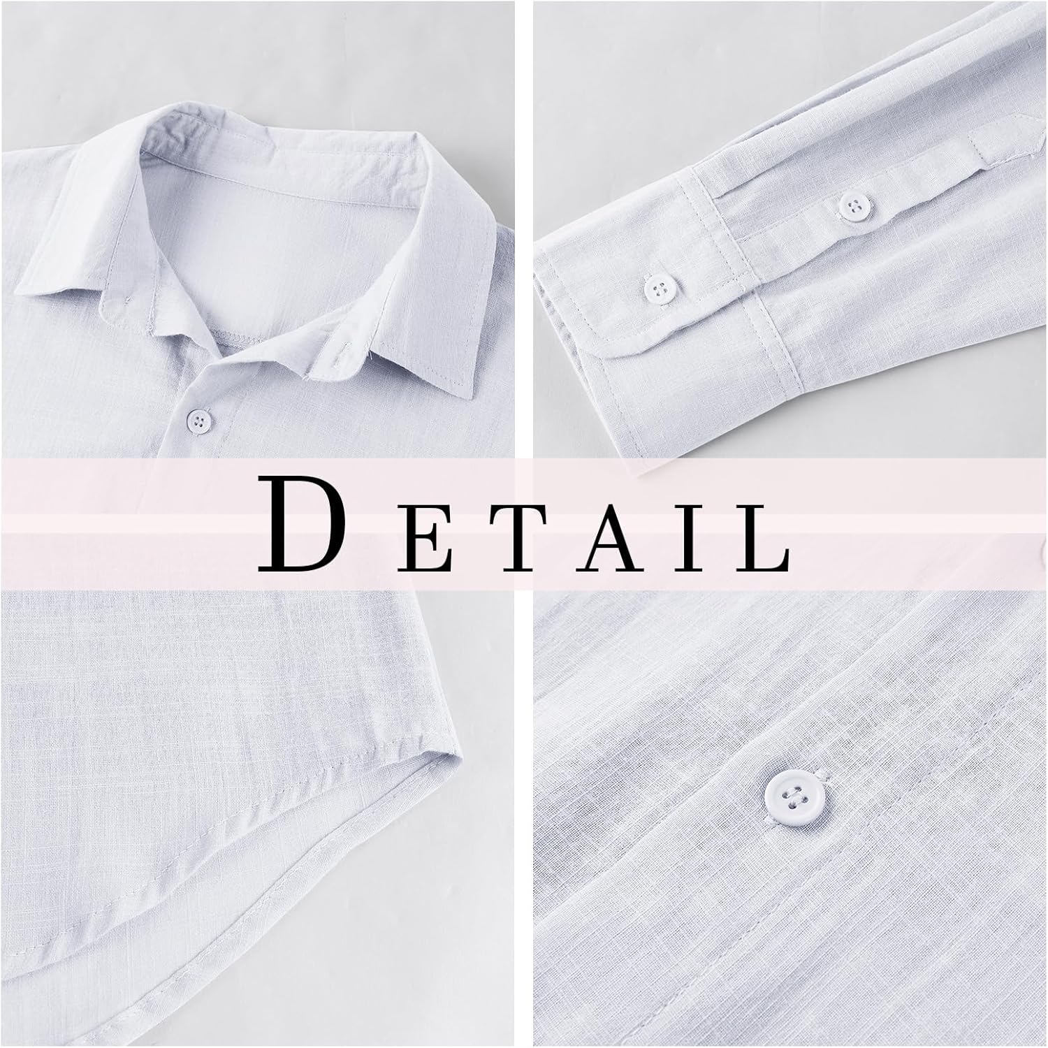 Das Hemd ist in den Größen M (Brustumfang 116 cm), L (123 cm), XL (132 cm) und XXL (141 cm) erhältlich, wobei die Größen etwas groß ausfallen können. Es wiegt leicht, ist aus hautfreundlichem Leinen gefertigt und in Farben wie Blau, Grau, Weiß, Schwarz, Dunkelblau und Khaki verfügbar, ohne Tasche und im Regular Fit.
