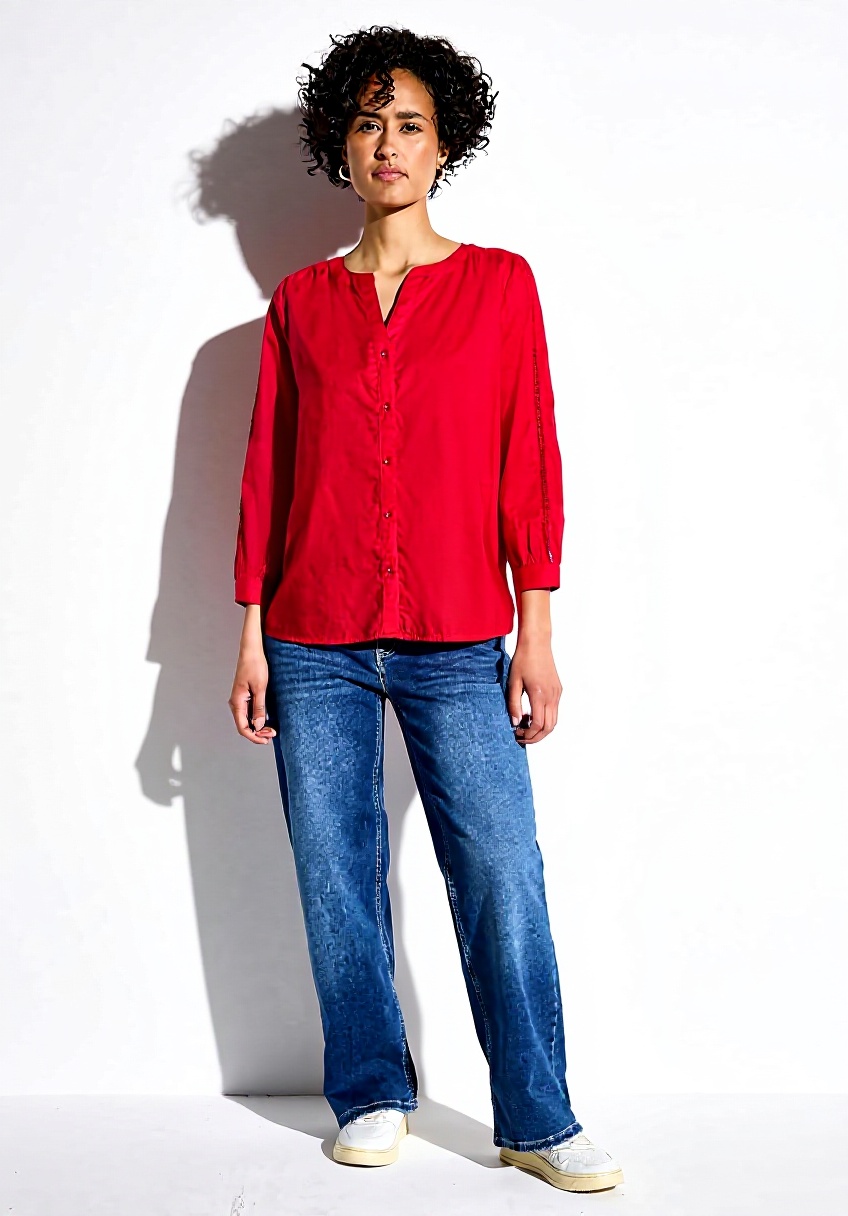 Die Bluse ist in der Farbe Glory Red erhältlich und in den Größen 34 bis 46 lieferbar, um verschiedene Körpertypen optimal zu umschmeicheln. Das Material besteht aus 100% Baumwolle für eine angenehme Hautverträglichkeit, mit einem leichten Gewicht, das sich ideal für den täglichen Einsatz eignet.