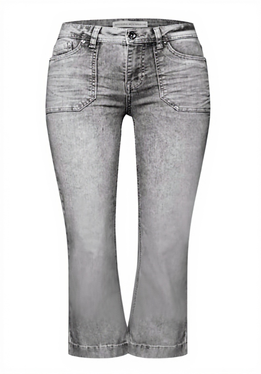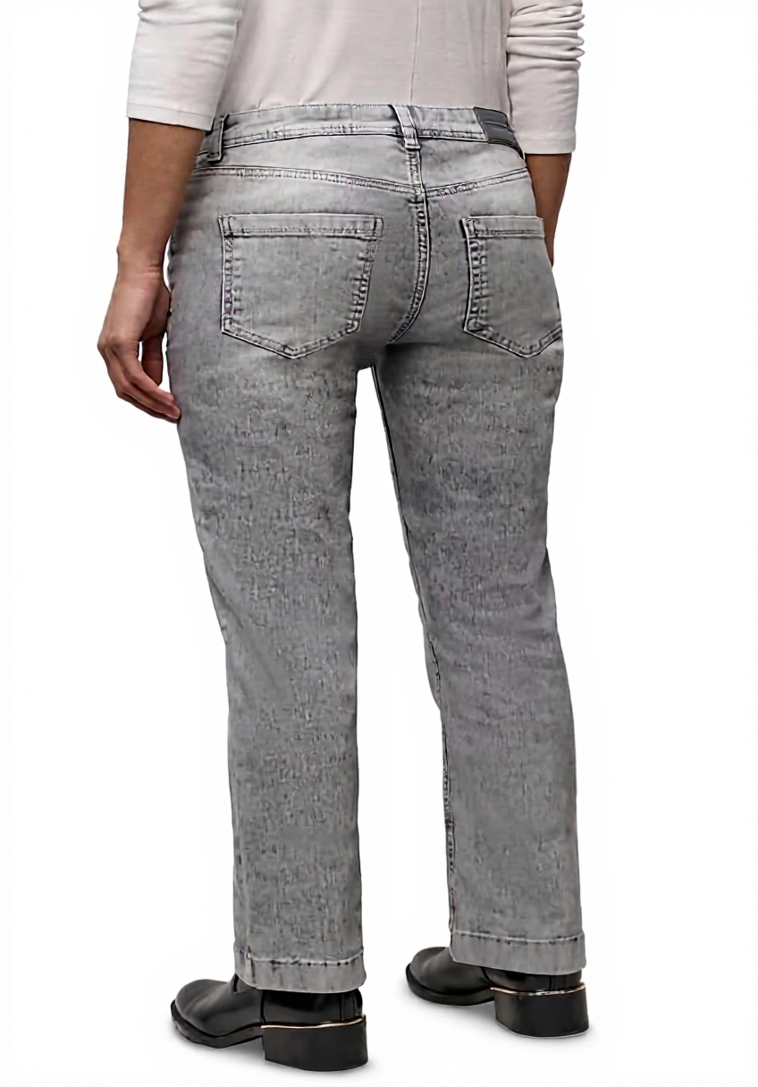 Diese Damenjeans von Street One überzeugt mit einem schlanken Slim Fit, der die Figur betont, und einem klassischen Bootcut-Schnitt, der sich elegant nach unten öffnet. Der High-Waist-Sitz sorgt für Komfort und eine moderne Silhouette, während die graue Waschung einen zeitlosen Look verleiht. Das Design im 5-Pocket-Stil mit praktischen Taschen rundet das vielseitige Erscheinungsbild ab.