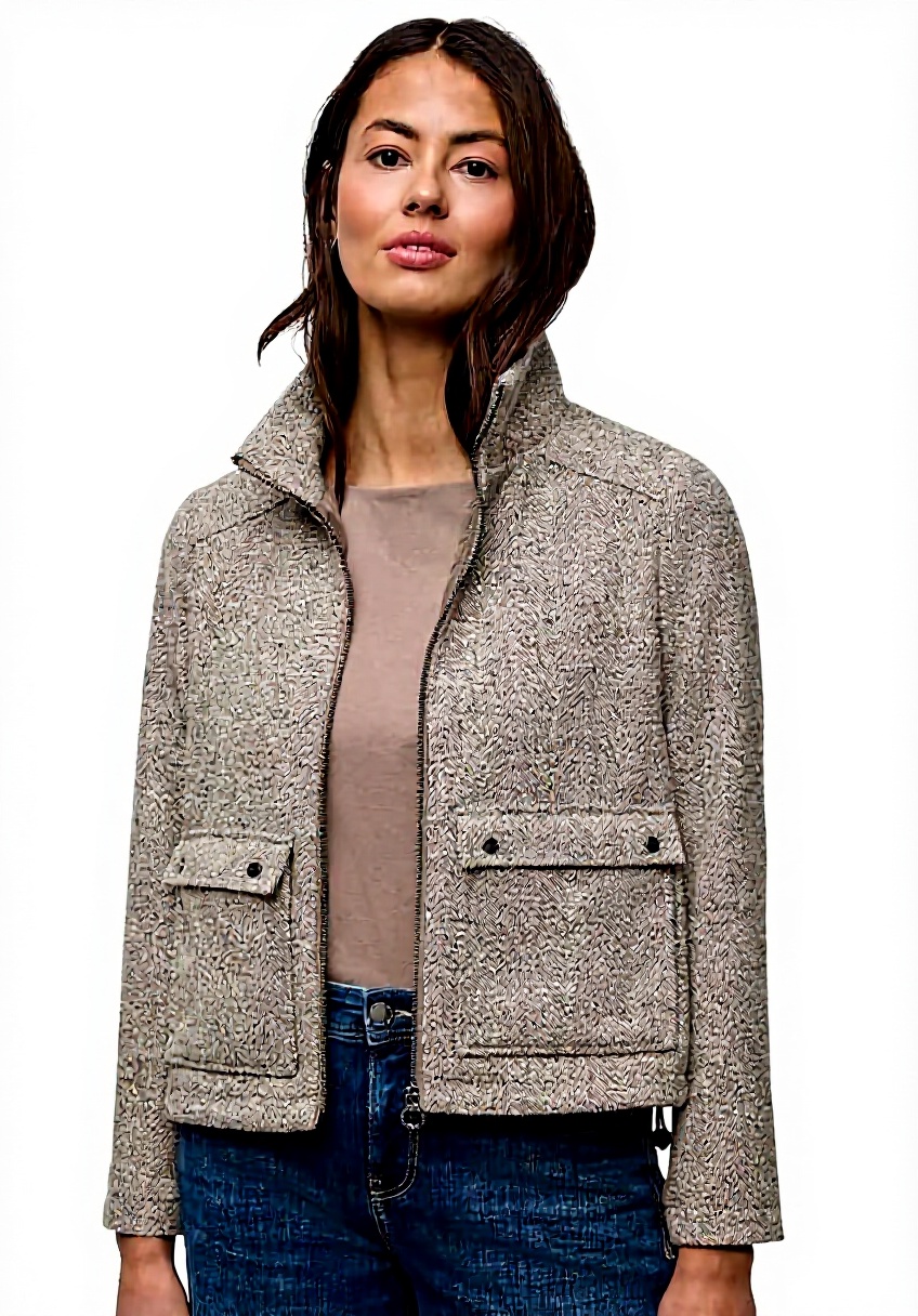 Die Jacke ist in den Größen 34 bis 46 erhältlich, mit einer Armlänge von ca. 62,5 cm und einer Brustweite von ca. 54,5 cm bei Größe 38. Hergestellt aus strapazierfähigem Material in der Farbe Light Terra Mocha Melange, bietet sie ein angenehmes Tragegefühl und ist leicht zu pflegen.