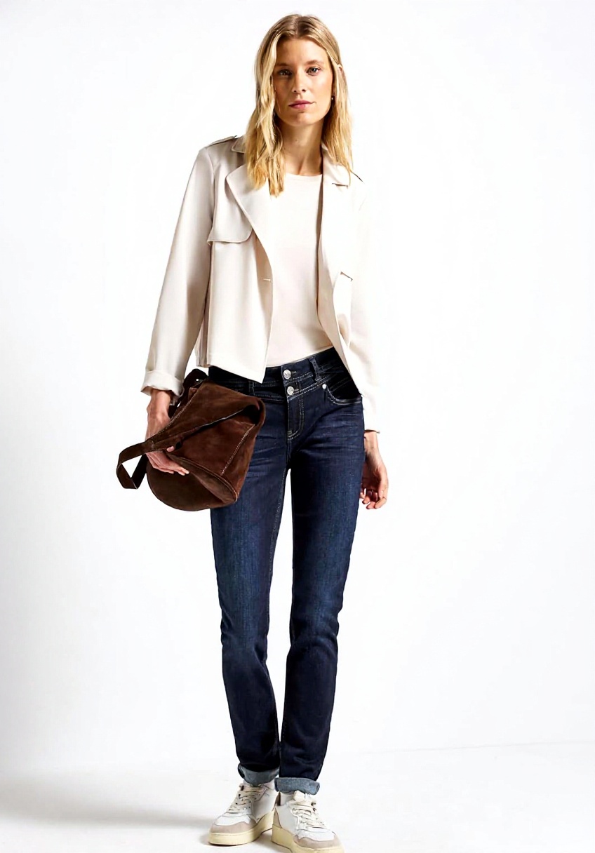 Diese Jeans von Street One überzeugt mit einem Casual Fit, der Bewegungsfreiheit und Komfort bietet. Der Mid Waist sitzt angenehm an der Taille, während die Slim Legs für eine schlanke Silhouette sorgen. Das klassische 5-Pocket-Design und die hochwertige Indigo-Waschung verleihen ihr einen zeitlosen Charakter.
