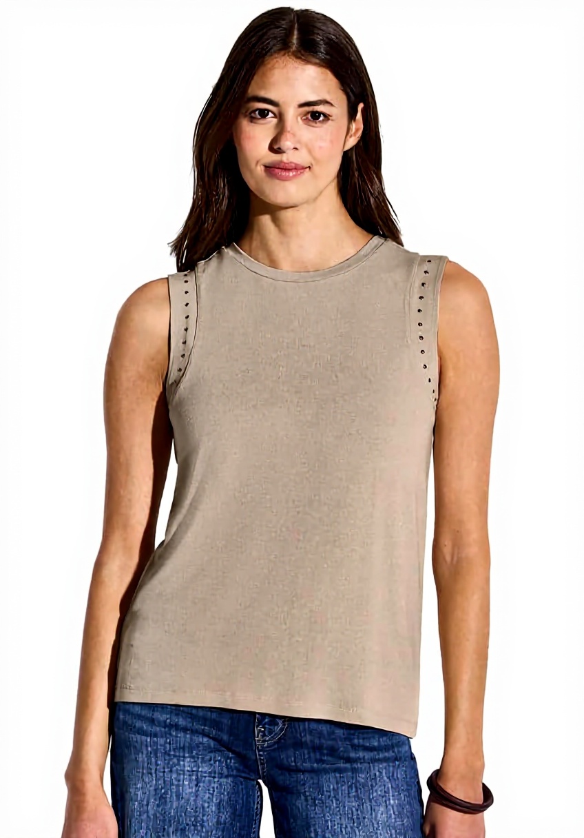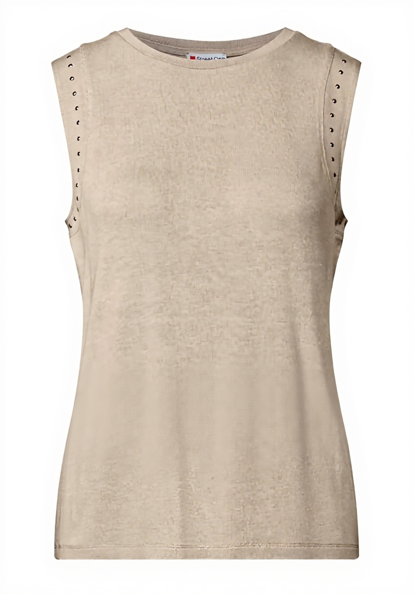 Dieses ärmellose Trägertop von Street One besticht durch seinen weichen Viskosemix mit Stretchanteil für optimale Bewegungsfreiheit. Die dekorativen Nieten verleihen dem Top einen modernen Akzent, während der Rundhalsausschnitt für einen klassischen Look sorgt.