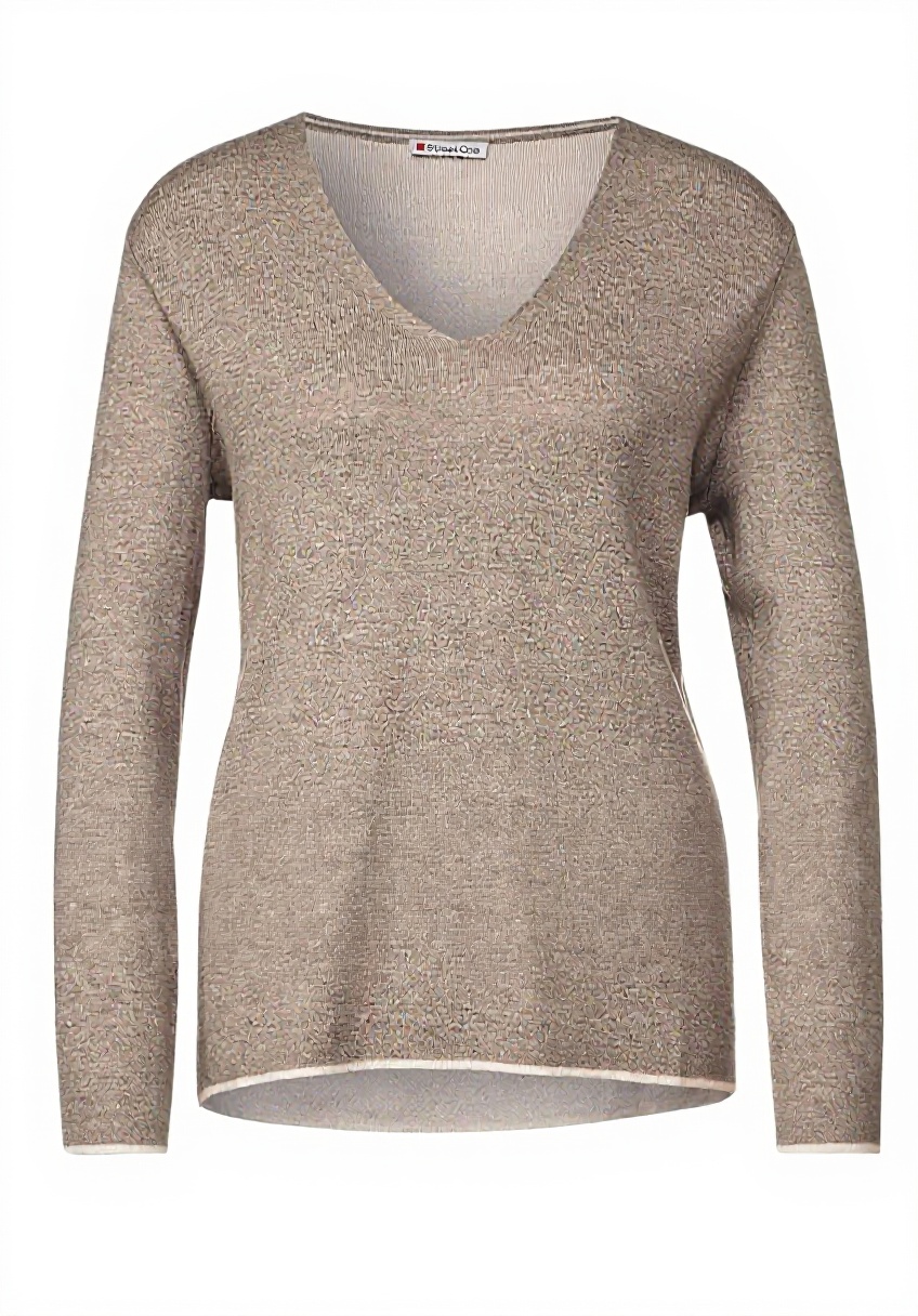 Dieser Pullover von Street One besticht durch seinen eleganten V-Ausschnitt und eine melierte Optik in Bleached Sand. Hergestellt aus hochwertigem Strickmaterial, bietet er Zierstreifen und seitliche Schlitze für eine moderne Silhouette und optimale Passform.