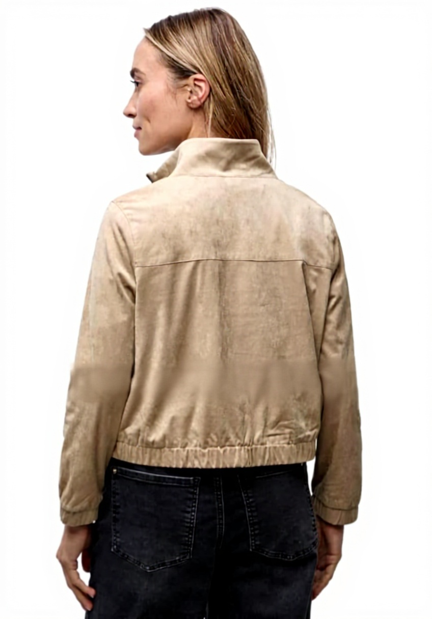 Diese Damenjacke von Street One besticht durch ihre hochwertige Velours-Qualität, die für ein angenehm weiches Tragegefühl sorgt. Mit einem modernen Stehkragen, seitlichen Taschen und elastischen Elementen an Saum und Bündchen vereint sie Funktionalität mit zeitlosem Design.