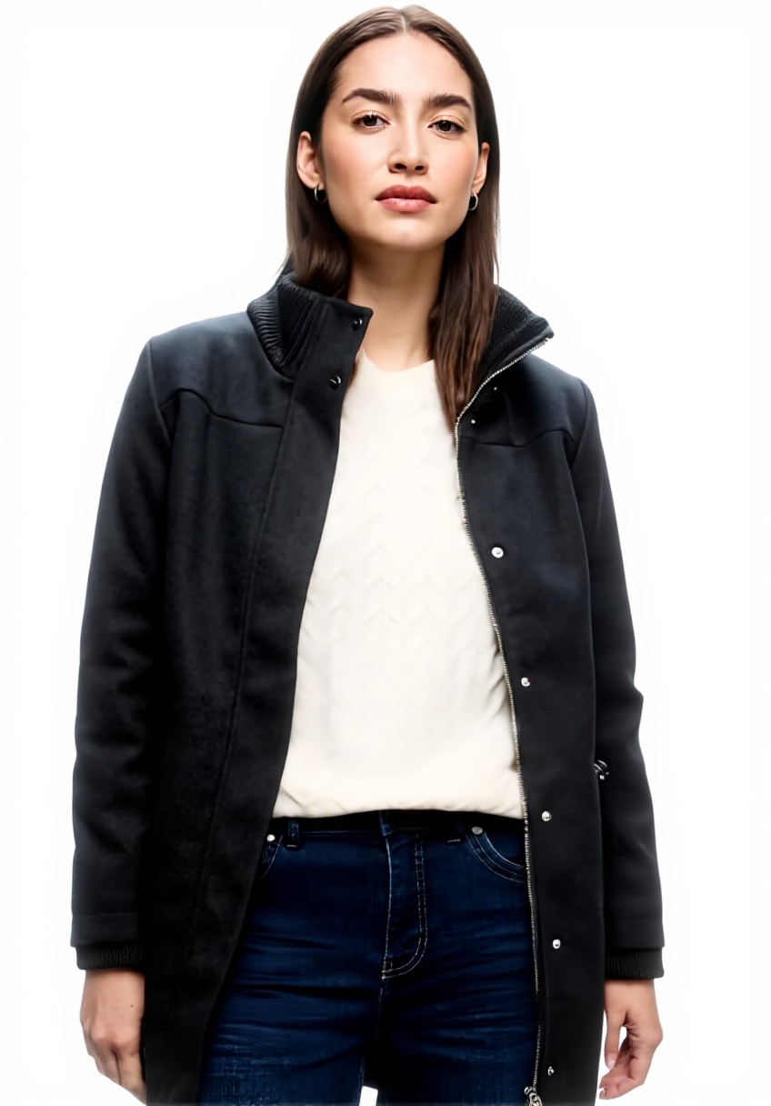Dieser Damenmantel von Street One kombiniert eine moderne Wolloptik mit raffinierten Strickdetails am Stehkragen für einen zeitgemäßen Look. Die Knopfleiste und seitlichen Taschen mit Reißverschluss bieten praktischen Komfort und funktionale Eleganz.
