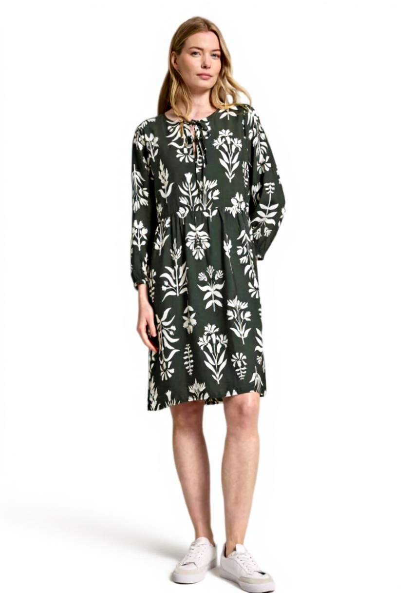 Das Kleid ist in der Farbe Desert Pine Green und in den Größen 34 bis 46 erhältlich. Es wiegt leicht und besteht aus einem pflegeleichten Viskosematerial, das sich angenehm auf der Haut anfühlt. Die Modellnummer F144449 gewährleistet eine konsistente Passform und Qualität.